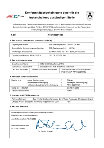 Die BSB Zweiwegetechnik GmbH & Co. KG ist nicht für den Teil ECM 4, die Instandhaltungserbringung, zertifiziert. Dennoch haben wir ein breites Netz an Kooperationspartnern (Zweiwegebagger und Zweiwegenutzfahrzeuge) im Raum Berlin – Brandenburg.